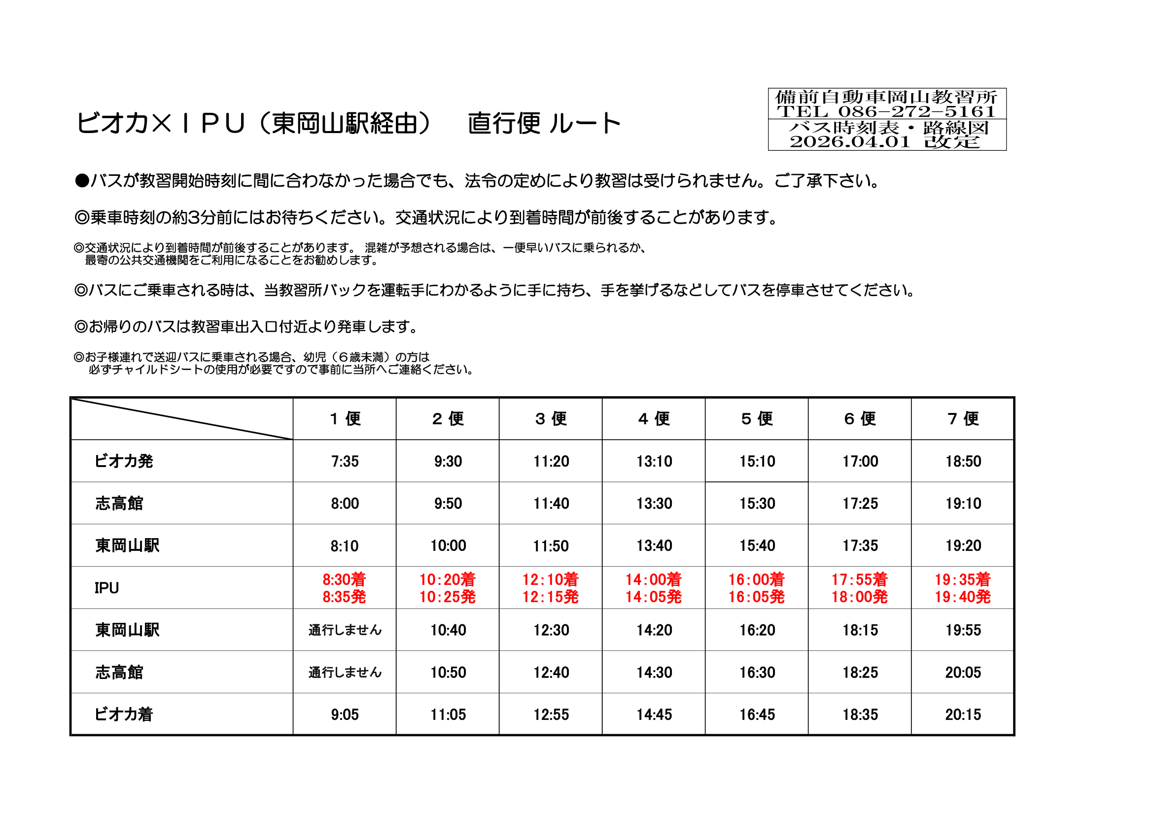 ビオカ(高島キャンパス)×IPU(東岡山駅経由) 直行便 ルート